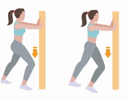 - ยืนก้าวขาไปด้านหน้าหนึ่งข้าง มือวางบนกำแพงระดับหัวไหล่ จากนั้นงอเข่าขาที่อยู่ด้านหน้าเล็กน้อย ขาหลังเหยียดตึง ส้นเท้าติดพื้น จะรู้สึกตึงที่น่องขาด้านหลัง ค้างไว้ 10 - 15 วินาที ทำซ้ำ 4 - 5 รอบ แล้วเปลี่ยนข้าง