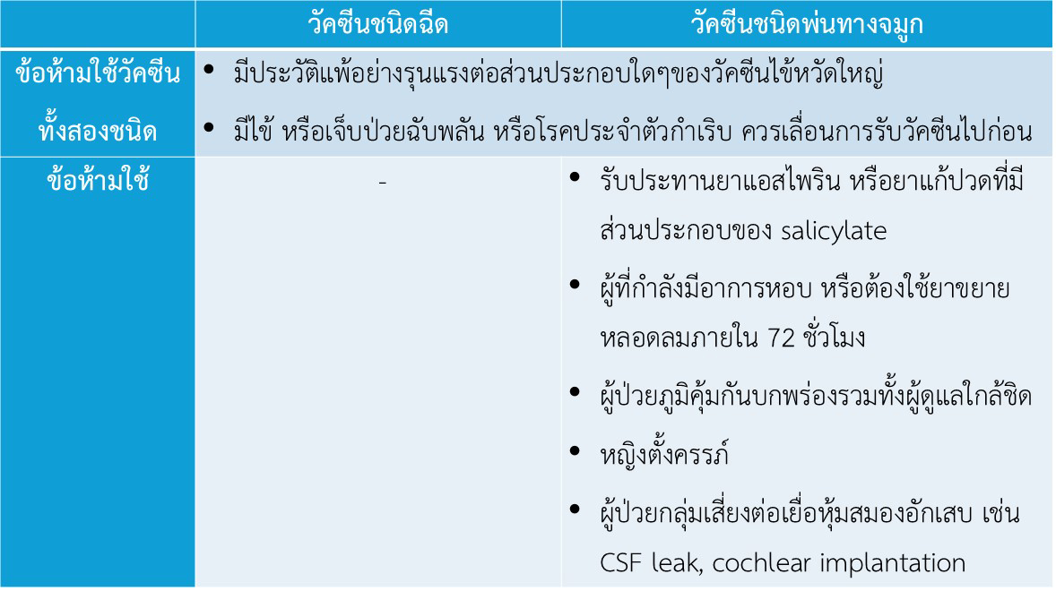ข้อห้ามใช้ของวัคซีนไข้หวัดใหญ่แต่ละชนิด
