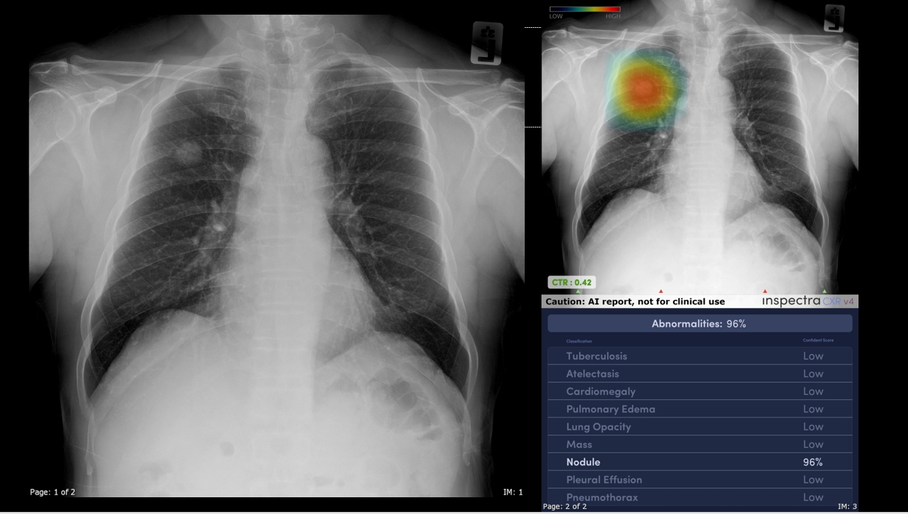 “Inspectra CXR” เทคโนโลยีปัญญาประดิษฐ์ (AI) ที่เข้ามาช่วยแพทย์ในการคัดกรองความผิดปกติรอยโรคที่สำคัญหลายอย่างในภาพเอกซเรย์ปอด และตัวระบบ AI ช่วยแยกความรุนแรงของผู้ติดเชื้อ ทำให้สามารถบ่งชี้ผู้ที่มีความจำเป็นจะต้องได้รับการรักษาอย่างเร่งด่วนได้อย่างชัดเจน